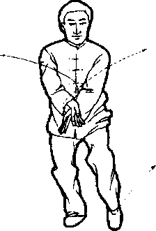 左上右下划弧运出。左手置于左上方,与头同高,右手置于右膝上方。