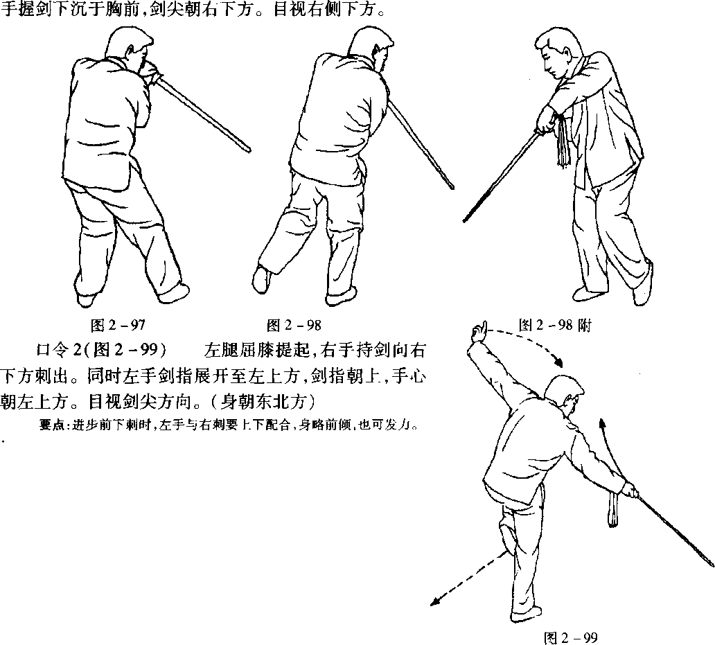 体随即右转45度。同时剑指下沉与右手相合,右手持剑微向上挑回收于胸前,目视前方。