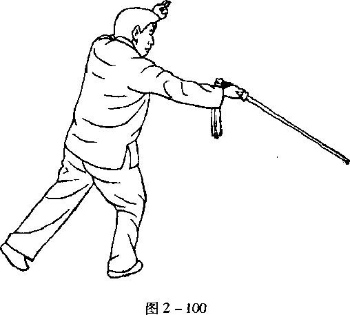 口令1(图2-100) 接上势。左脚向后落步,脚尖点地,右腿屈膝半蹲,重心在右腿,上