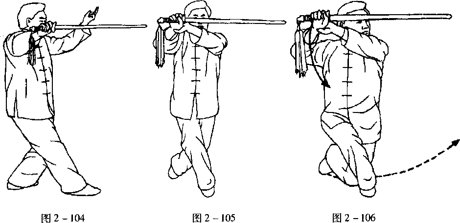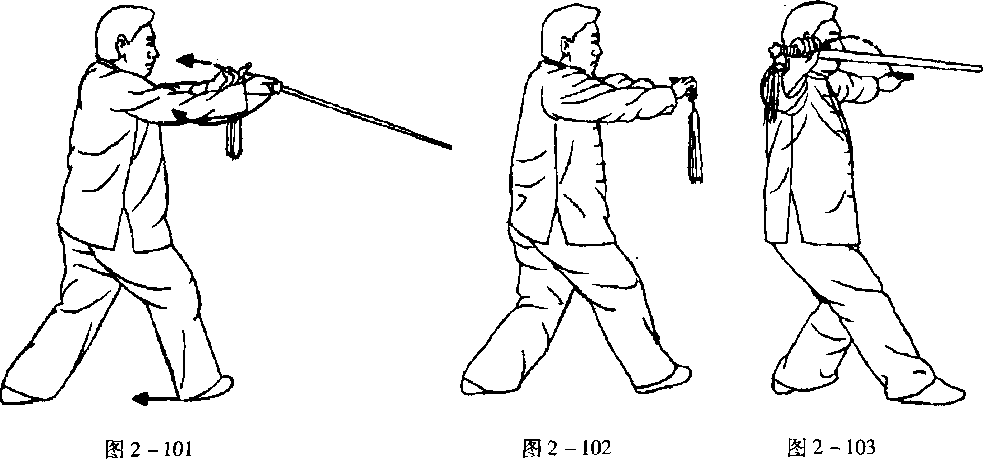 口令2(图2-101、102、103) 重心迅速左移,右脚快速向后撤半步,脚跟发力。同时右手