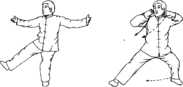口令2 (图1 - 848.849) 身体左转90度,重心移至左腿,右腿提起,脚尖下垂,同时右拳