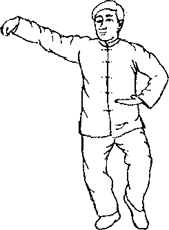 2.此势须掌握双手合后的螺旋上升。另外,置于左腰侧的左手,必须做到正确逆缠,须从外缠回到腰间,这也是使左