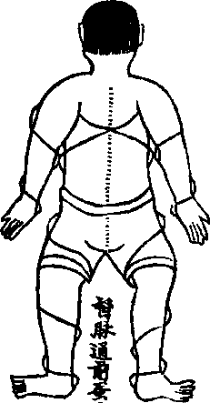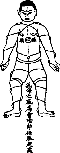 背面头顶为顶劲,大椎为 分路,分路下为膂,正中骨为 脊,两肾为腰。足之虚实因乎 手,手虚足亦虚,手实足亦实。