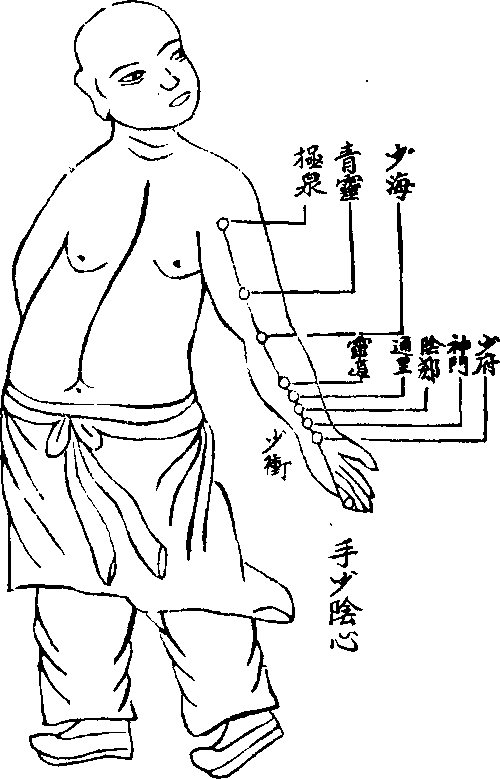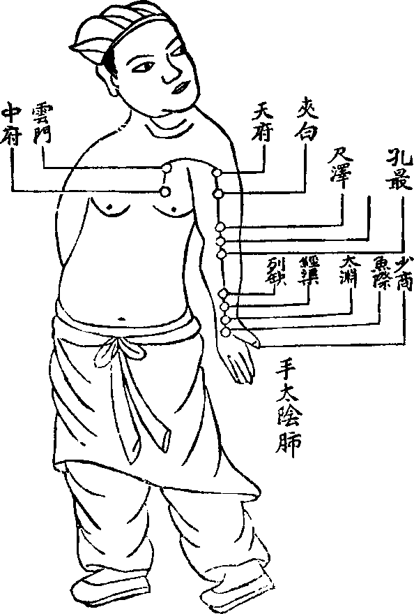 太阴肺兮出中府, 云门璇讥旁六寸, 天府胁下三寸安, 尺泽肘中约纹论, 列缺腕侧一寸半, 太渊掌后横纹骨, 少商大指端内侧,