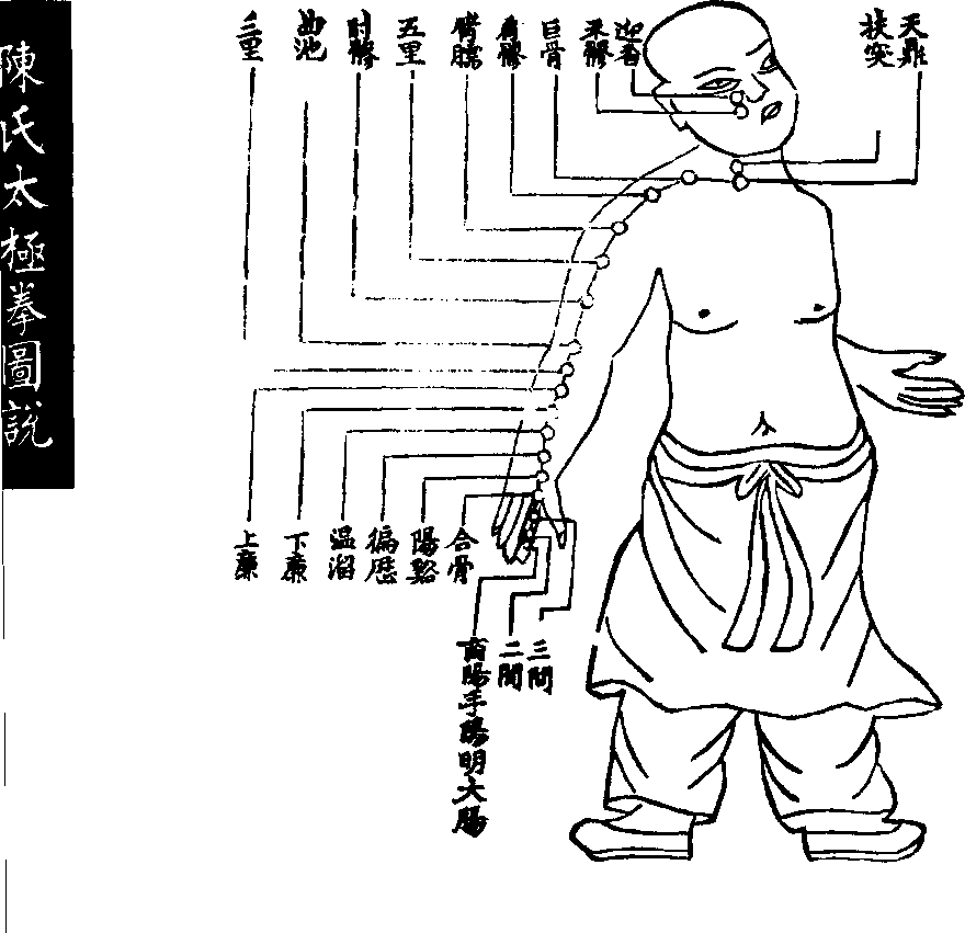 商阳食指内侧边, 三间节后陷中取, 阳谿上侧腕中是, 温溜腕后去五寸, 池前三寸上廉中, 曲池曲骨纹头尽, 大筋中央寻五里, 臂脯肘上七寸量, 巨骨肩央端上行, 扶突天鼎旁三寸, 迎香禾鹘上一寸, 二间来寻本节前, 合骨虎口歧骨间, 偏历腕后三寸安, 池前五寸下廉看, 池前二寸三里逢, 肘醪太骨廉外近, 时上三寸行向星, 肩鹘肩端举臂取, 天鼎喉旁四寸真, 禾修水沟旁五寸, 大肠经穴自分明。