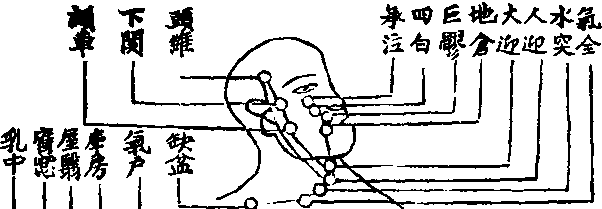承泣目下七分寻, 巨修鼻孔旁八分, 大迎颔下寸三中, 下关耳前动脉行 人迎喉旁寸五中 气舍突下穴相寻 各去中行寸半明 至乳六寸又四分
