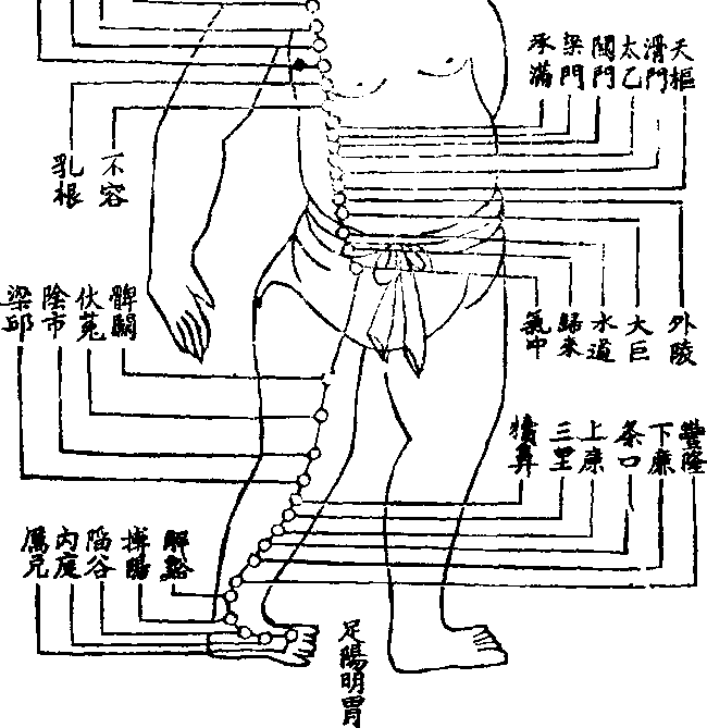 库房屋翳膺窗迎, 次有乳根出乳下, 却去中行须四寸, 不容巨阙旁三寸, 其下承满与梁门, 上下一寸无多少, 天枢脐下二寸间, 枢下二寸大巨穴, 枢上六寸归来是, 气冲鼠簸上一■寸, 髀关膝上有尺二, 阴市膝上方三寸, 膝膑陷中犊鼻存, 膝下六寸上廉穴, 膝下八寸下廉看, 却是踝上八寸量, 解谿去庭六寸半, 陷谷庭后二寸间, 厉兑大指次指端, 乳中正在乳头心, 各一寸六不相侵, 以前穴道与君陈, 却近幽门寸五新, 关门太乙滑肉门, 共去中行三寸中, 枢下一寸外陵安, 枢下四寸水道全, 共去中行二寸边, 又去中行四寸专, 伏菟膝上六寸是, 梁邱膝上二寸记, 膝下二寸三里至, 膝下七寸条口味, 膝下九寸丰隆系, 比那下廉外边缀, 搏阳庭后五寸换, 内庭次指五间陷, 去爪如韭胃并判。