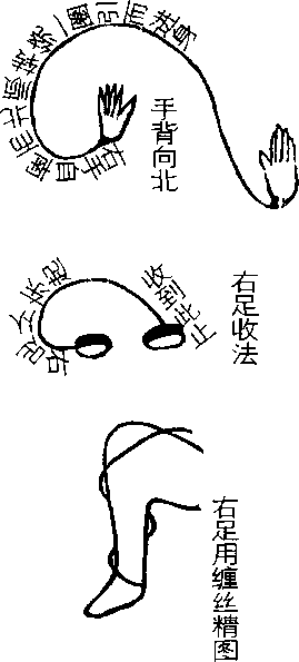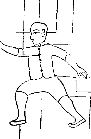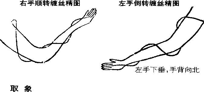 本势不必用大身法转关,但用小身法过角可也。以本势不必用大身法转关,但用小身法过角可也。以为主,左手为宾,前之右手手背向北者,今一与敌交手, 右手即顺势转过来,自南而北,复转至南,转(顺转)一 圈以作引进◎击搏之势,右手在东落下,手与腰平,手 背向北以伏下势,前进拨左面敌侵之势,右膝屈住,右 足亦有顺转之意,平实踏地,虽然至实之中至虚存焉, 而左足在西,足指向前,惟静以待动而已。