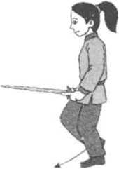 (2) 同时右手持剑向下绕至腹前,剑身斜置于身体左侧;