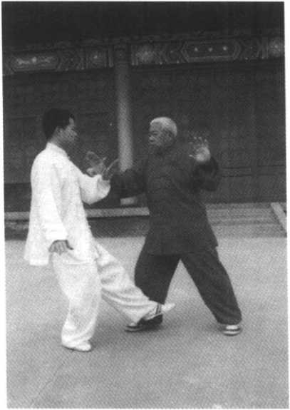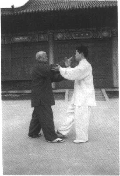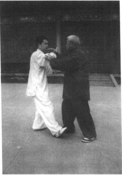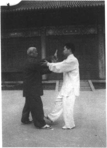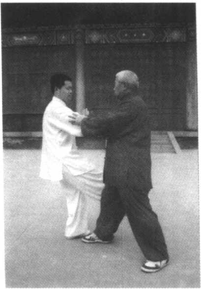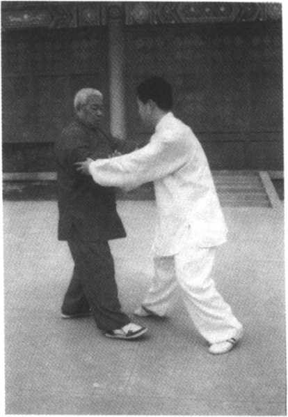 甲方进右步,用双手向 乙方推去,乙方右步在前,用 右手臂接粘引化,甲顺势用 右手指向乙喉部点去,乙急 用右手向上架,这时甲方弓 步进身,顺其向上之劲,用右 肘向乙胸部击去,使其后跌 (图 59)O