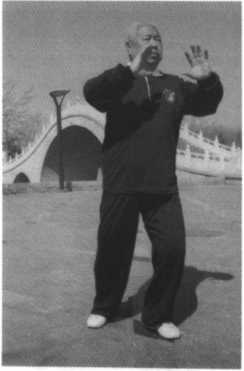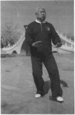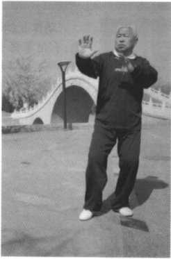 动作一:承前式,腰微向 右转,重心移于右腿;同时吸 气,两手内合划弧向右后方 搬带,后向上拥起至胸前,右 实腿要精神贯注;随之,腰微 向左转,左腿向东南方迈步, 以足跟着地,目视两手前方。 (图4)