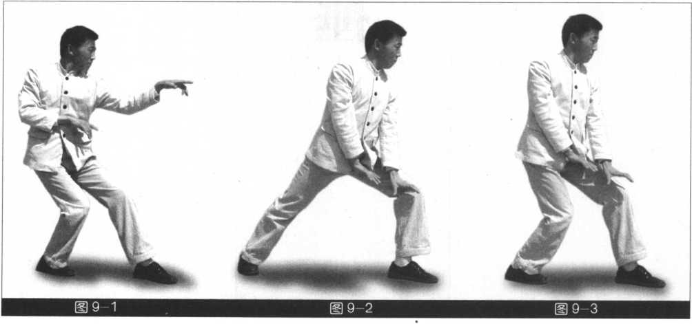【盘 法】承上势,以头领身、身带步,右脚蹬劲,左脚向前踩出,内扣15° ,后脚随 追半步,同时双掌前扑下按于裆部(图9-2?3)。