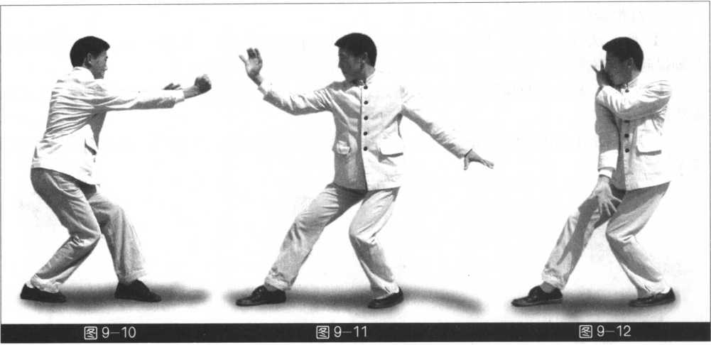 【盘 法】承上势,向右转身180° ,左手护住右腮、右手,掌心向左护裆,成右鸡步 站立,右肩领前,两手均要裹合(图9-11?12)。