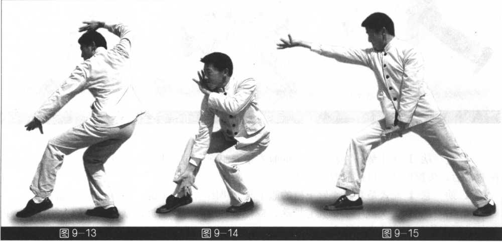 【盘 法】左脚向前踩出,同时右手由下向上斜撩,左手下按护裆。左肩领前,目视前 方(图 9—13)o