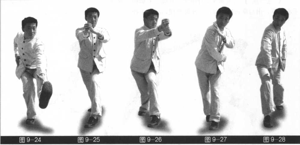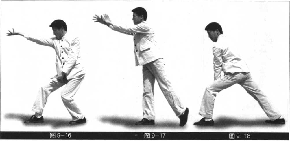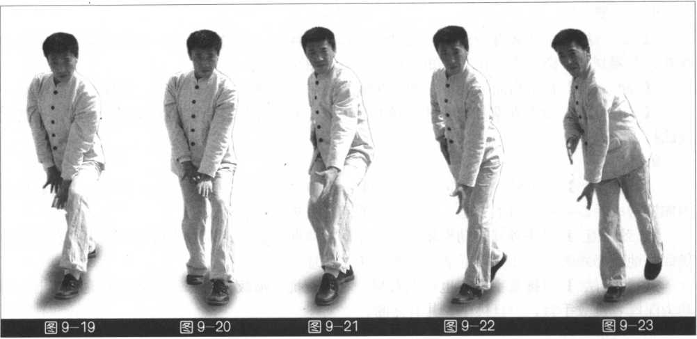 【盘 法】以头领身,身带步,左脚过右脚向前踩进一大步,后脚随追半步,同时左手 手心朝下,由右掌背向前穿出,此即鹰捉,随即下扑,双手扑按于裆部(图9-17?20)。