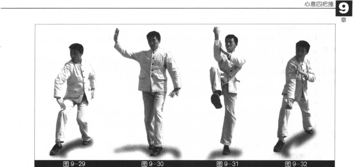 【盘 法】左脚向前踩进一步,同时提右膝向上冲顶,脚尖勾起,右拳向上冲打,左手 护于右肘处,两臂合劲,含胸拔背,顶劲竖项(图9-30?31)。