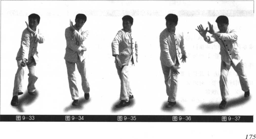 【劲 意】两肘前后要有对撑之劲,左右手前后撩击时犹如撕物一样, 身拧裹,如蛇之盘旋,发力抖弹(图9-34?35)。