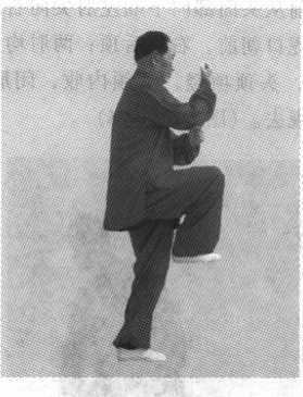 接上式。身体前起,左脚原地不动,右膝上贯,脚掌上 提,左腿独立成左独立式。同时,左掌握成拳,往右肘尖下运 转去,用拳眼顶住右肘尖;右拳与右脚上提、右膝上贯一道进 行,往上顶击,拳眼向右。头顶项竖,下颌里收。闭唇叩齿, 舌顶上腭。眼向前方视去。(图5-3-27)