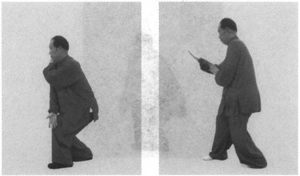 【要点】此式为缩式。全身有缩合劲,右拳向敌方裆部