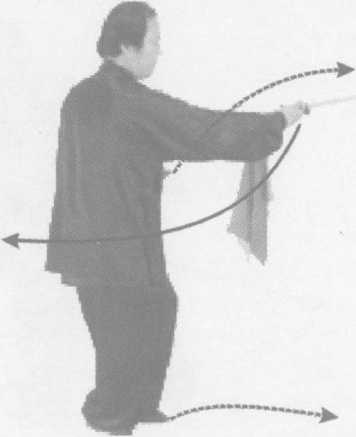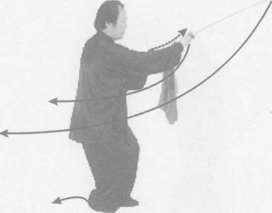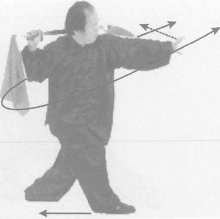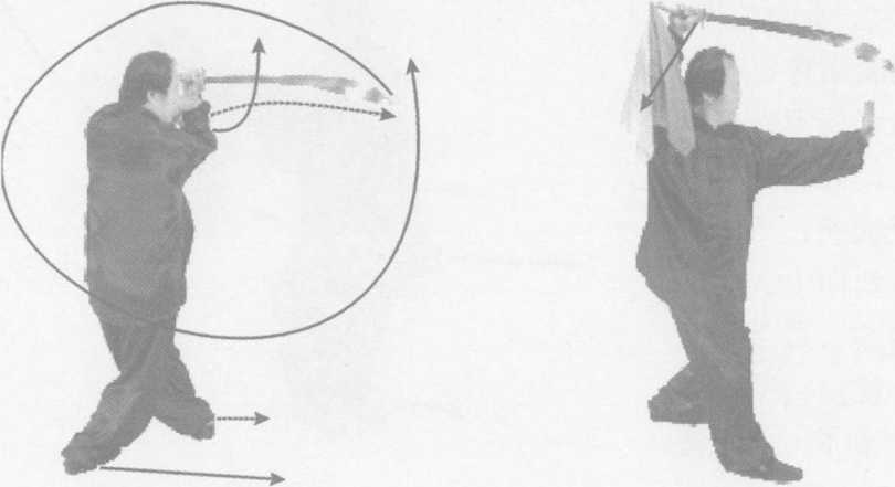 10. 雄鹰探爪 接上式,左 脚后退并右脚, 两腿微弯;同时, 右手持刀外旋从 后向前朝左横扫 至胸前,刀尖朝 前斜向上,刀刃 向左;左掌落于 小腹前,掌心