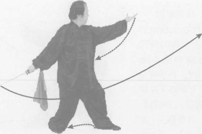 接上式,右脚向前上一步,左脚跟微离地面;同时,右手持刀 外旋,刀刃向左斜向前 上刺,高于肩;左掌向左 后伸,掌心朝下,眼视刀 身(图 9-21)0