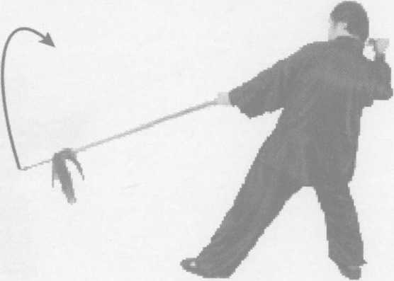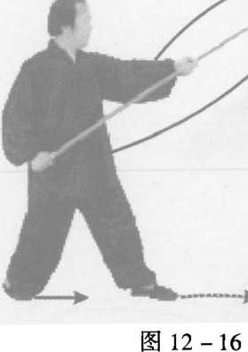接上式,左脚前 寸,右脚随势自然调 整;同时,右手握枪向 左上摆拨225°,左手握 中随势回带枪身至身 后,枪尖朝后斜向下,眼视前方(图12-17)。