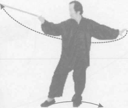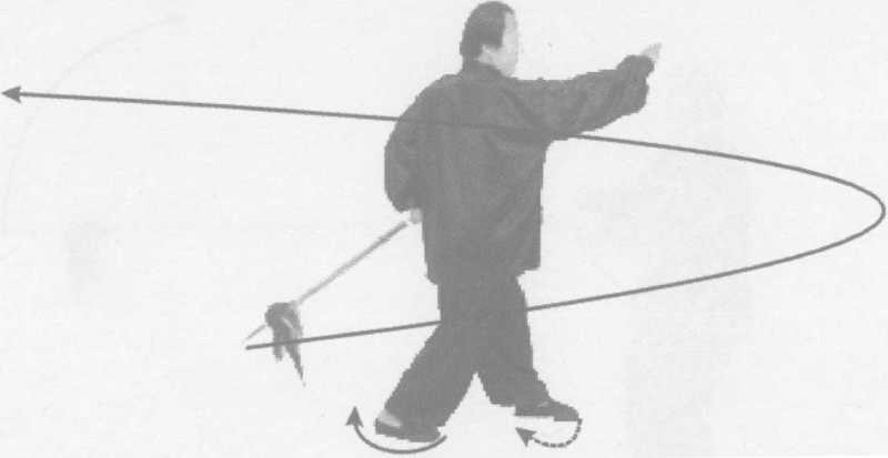 接上式,右脚尖外摆180°,左脚尖内扣135°,身随向右转 180°;同时,右手握枪随身向右旋至小腹前,左手握中随势向右 旋360。至正前方,左手向内滑至右手前,枪尖朝前,高与小腹