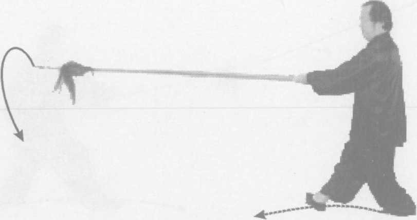 接上式,左脚向前上一步,右脚在后不变;同时,右手握枪内 旋上反至右肩上方,身微向右;左手前伸握中外旋,枪尖随势向 上往左画圈,枪尖高与膝平,眼视枪尖(图12-19)O