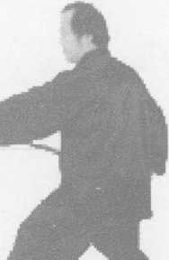 接上式, 左右脚前后 不变,成三体 式步;同时, 右手握枪外 旋下落至肋 间,左手握中 内旋虎口下
