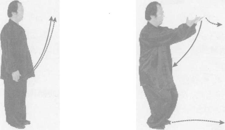 接上式,左右掌同时外旋,掌心朝上,向前上托,高与视线 平,两掌之间略宽于肩;两腿微弯,膝盖下垂线与脚尖齐(图4 - 211)0