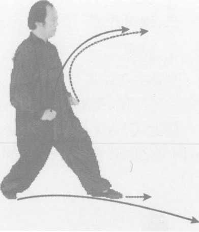 接上式,左脚向前上一步,脚尖微靠中线,右脚在后不变,重 心前四后六;同时,左掌内旋向前顶劈,掌心朝下斜向前,高与口 平;右掌内旋下按至小腹前,掌心朝下斜向前,肘微靠肋,眼视前 方(图 4-212)0