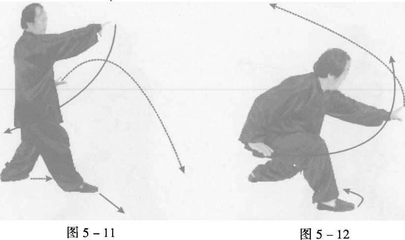 掌内旋向前下扑,掌心朝下斜向上,高与膝平;右掌下按至胯侧, 掌心朝下,身形下蹲,眼视前下(图5 - 12)o