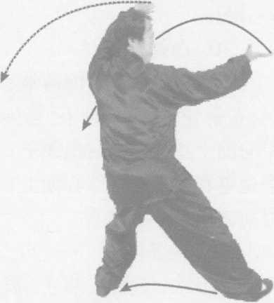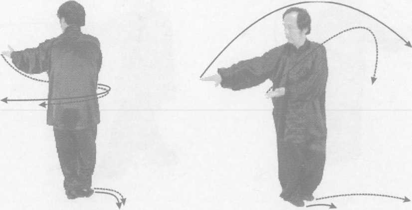 接上式,右脚尖向右摆 135°,左脚随并,身随势向 右转180。;两掌随势从左横 扫至右侧后,右掌向后伸,