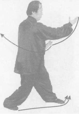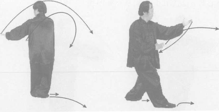 接上式,右脚向前寸,离中 线45。,左脚自然调整;同时,左
