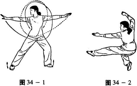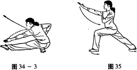 ①右掌接上式自左向上,右掳,左掌随之自右向下,左 直臂划弧,眼看右掌。转身,手掌下划弧。(图34- 1)