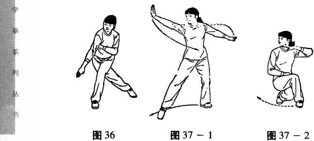 ①右腿上步,右脚尖着地,左膝仍微屈。右掌自下而向 左、上、右抡臂,掌心向外,左掌自下向右抡臂,掌心向下。 (图 37 - 1)