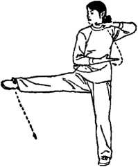 双手仍抱掌成“手抱银瓶”的架 式,双膝直起后右腿提膝向右前斜 方弹踢。(图38)