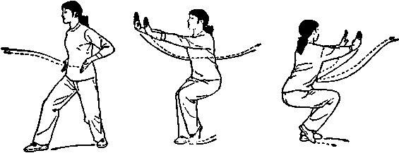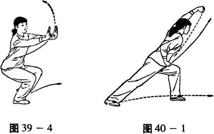 图 39 - 1图 39 - 1图 39 - 2图 39 - 2图 39 - 3图 39 - 3左丁步双推掌。丁步双推掌是三个连环动作。所以接上 式,身体右转,右脚向右前方跨一大步,左脚迅速跟上向右 脚并拢成左丁步,脚尖点地,脚跟提起,两膝屈曲半蹲,同 时两掌收回腰际随后向右前方推出,力点同上,眼看前方。 (图 39 — 4)