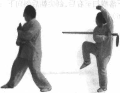 二式连练,缩身独立。金鸡独立意在 脚,提膝顶裆顺势蹬,提起之脚配合剑法可 前落后落左右摆,蹬挑踩绊随势变。
