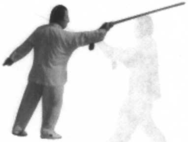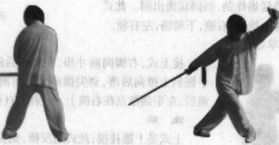 多彩,变化万千。此式先是向前进攻,突 变顾其后,这是声东击西战术,也是剑术