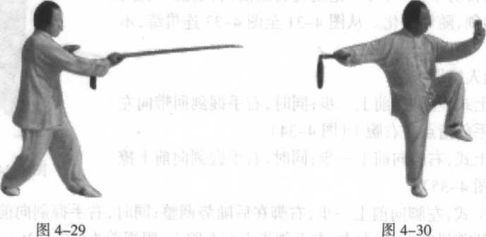 (2)接上式,左脚提起,右腿独立;同时,右手握剑猛向后抽,剑尖向前,刃左右, 左手剑指向前指,眼视前方(图4-30)。