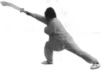 二式连贯完成,身刀高度协调, 动作旋绕流畅,爆发力勇猛快捷,力 达刀头。行走中变换攻防角度,从低 至高,从高至低,上下盘旋一招多变, 横挑撩旋合为一体,刀随身走,招随 势变。