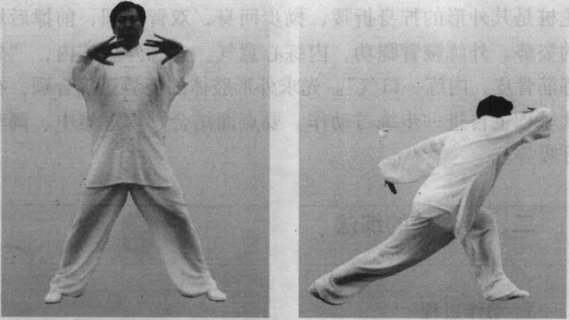②成定势时,要注意两手、两臂的位置。上手臂要有撑 劲,下手要有捋按劲,腰身要有拧劲。不能用僵劲、拙劲、蛮 劲,要放松,保持外形各部的正确,胸微含,头微顶。