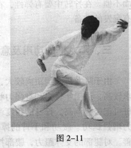 左侧方,左臂撑圆,左肘略 高过肩,右掌在右胯后方, 掌心向下,掌指向前,右臂 撑圆。头向右转,目视右掌。 此为右降龙桩势(图2-11)。