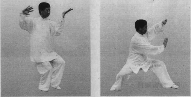 ②两手动作要注意身法的配合。双手向前而身微向后,手 向上而身微下坐,手向后而身向前,双掌推出腰身有微向上翻 之意。身形微向下坐,而头要向上顶。