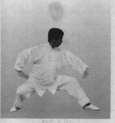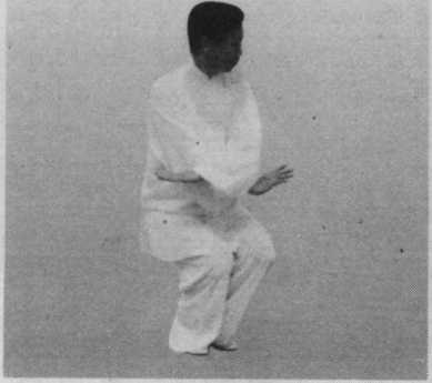 ①右足提起,横足前落与右拳下插和身形下坐要完整一 致。