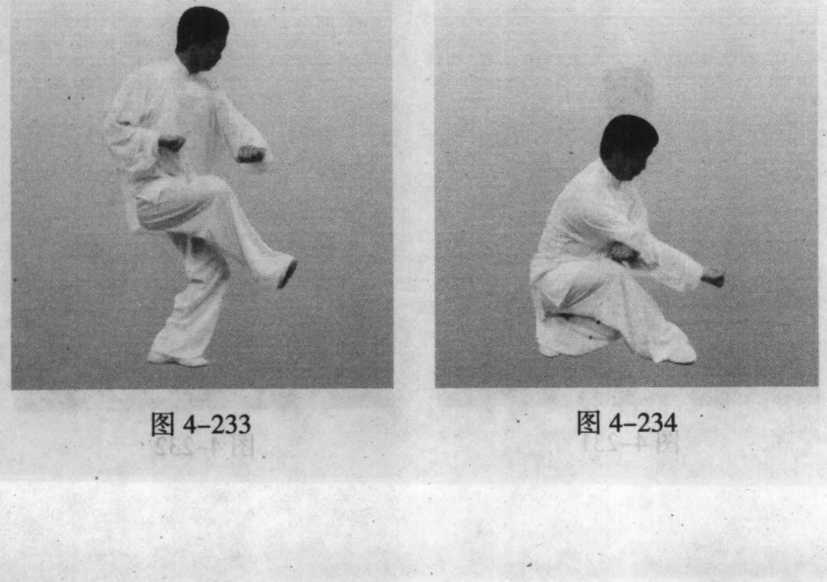 ②右腿提膝,右足尖外摆,向前横足上一步,两腿屈膝下 蹲成歇步型。同时,右拳自右肋经胸前向前、向下插,拳心向 前,高与胯齐。目视右拳(图4-234)。