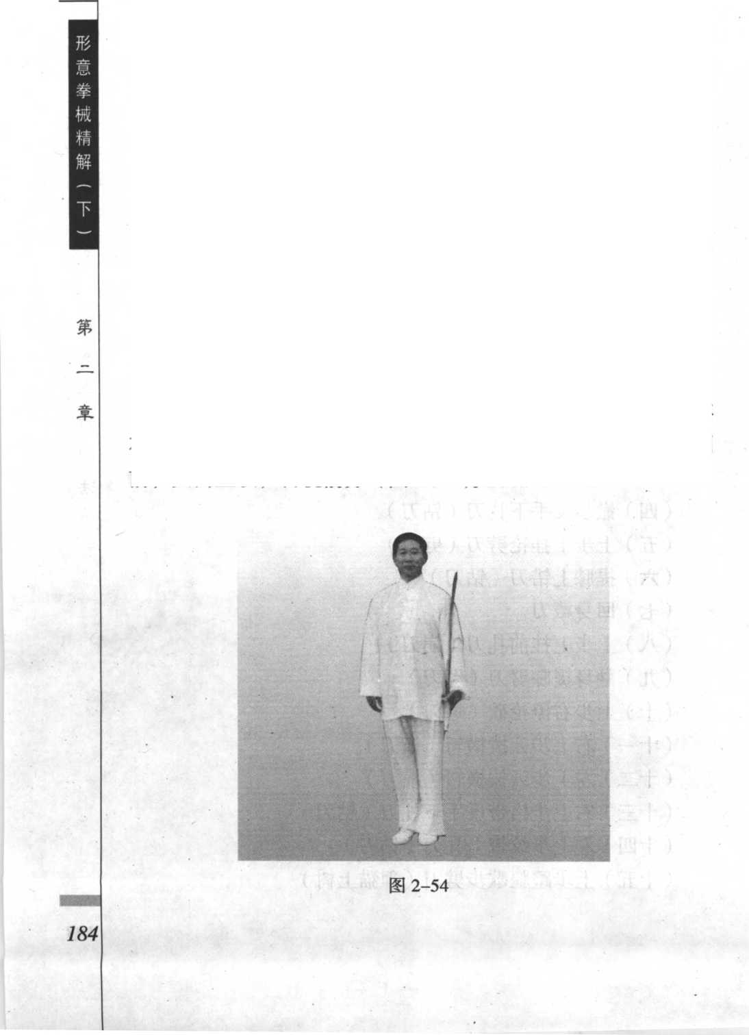 两腿成立正姿势,面向练习方向成45。站立;右手垂于体 右侧,左手托住刀盘,刀尖朝上,刀背贴于左臂上,刀刃朝 前;头向上顶,目视前方(图2-54)。