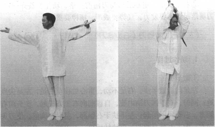 两手自体两侧同时向上抬起,至头顶前上方,右手抓握刀 柄,左手松开成掌,扶于右手腕部;目视左前方(图2-55、 图 2-56 )o
