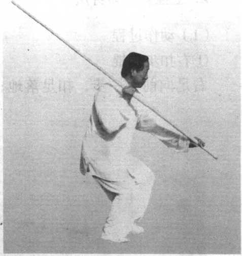 左足跟进至右足内侧不 落,两腿靠拢;同时,右 手握棍,使棍梢先向下落 与腰平后,再向上、向后 挂起,使右臂向怀中拉 带,右手至右肩前方;左 手棍向腰前推,高与腰 平;收腹含胸,右肩微向后移,目视前方(图5-4)。